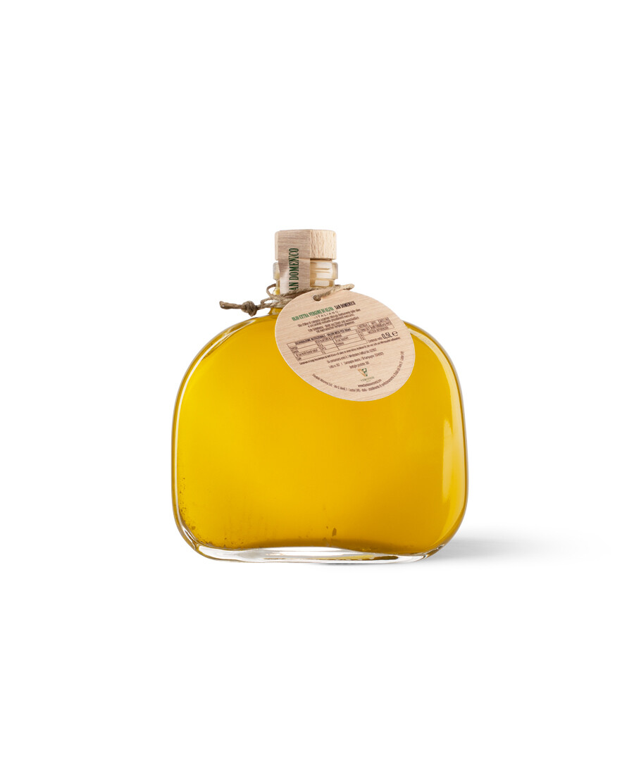 "Nella cisterna piccola c'è l'olio buono", il San Domenico infatti, subito dopo esser spremuto, viene messo in una piccola cisterna e collocato sotto terra, per poi essere imbottigliato solemente il giorno di S. Domenico, cioè l' 8 Agosto. La disponibilità di quest'olio dal sapore pieno ma molto morbido è infatti limitata a qualche centinaia di bottiglie ogni anno. ITALIANO. Estratto a freddo.